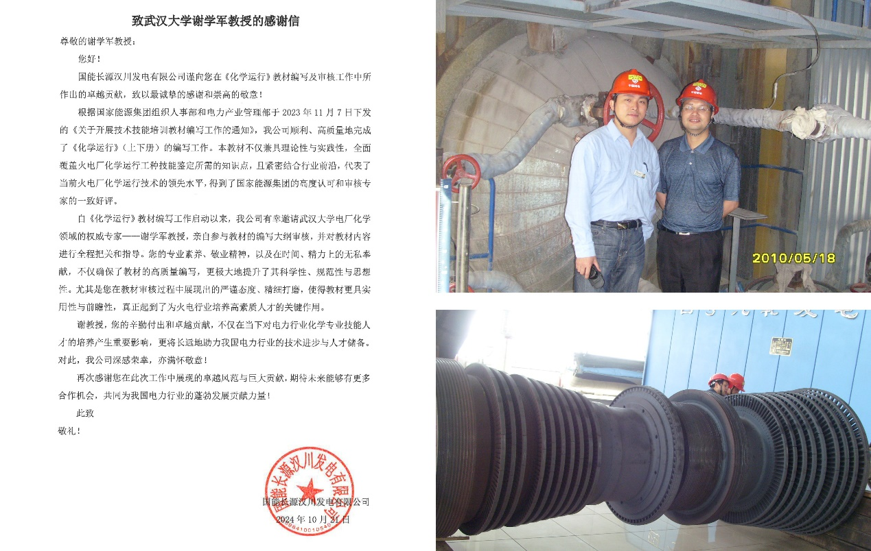 近日,国能长源汉川发电有限公司向番号鸽 谢学军教授发来感谢信,高度评价了他在《化学运行》教材编写及审核工作中所做出的卓越贡献。