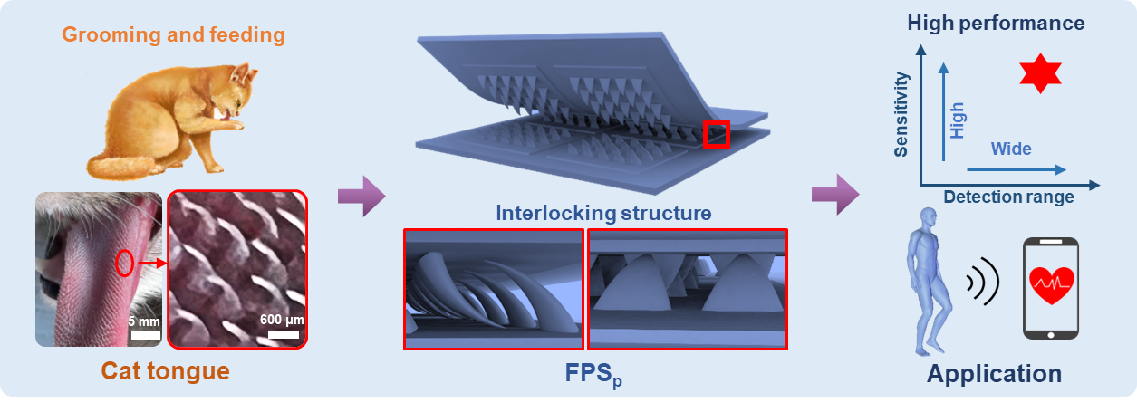 受猫舌头上丝状乳突的启发,薛龙建教授团队构建了一种具有互锁仿生结构的柔性压力传感器(FPSp)。与传统微结构不同,仿丝状乳突结构可以在压力增加的过程中转移应力集中的位置,从而有效避免应力累积导致的灵敏度降低。因此,FPSp具有高灵敏度(高达 504.5 kPa−1)、宽检测范围(30 Pa–350 kPa)、快速响应(83 ms)、高耐久性(8000 次循环)和高稳定性的良好传感性能。作为应用展示,FPSp可用于监测人体生理信号和人机交互界面。这项工作为高性能可穿戴压力传感器提供了一种新的设计策略。