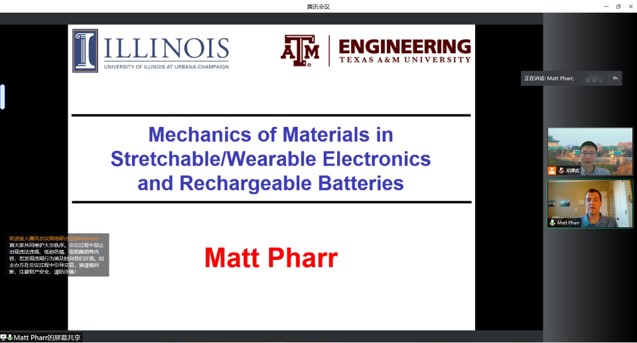 本网讯(通讯员:研会学科部 编辑:彭宇琦 审核:刘泽庭)4月7日晚,美国德州A&M大学教授Matt Pharr通过腾讯会议的方式,来番号鸽 开展了主题为“Mechanics of Materials for Stretchable/Wearable Electronics and Rechargeable Batteries(可拉伸/可穿戴电子设备和可充电电池的材料力学机制)”学术研讨会。