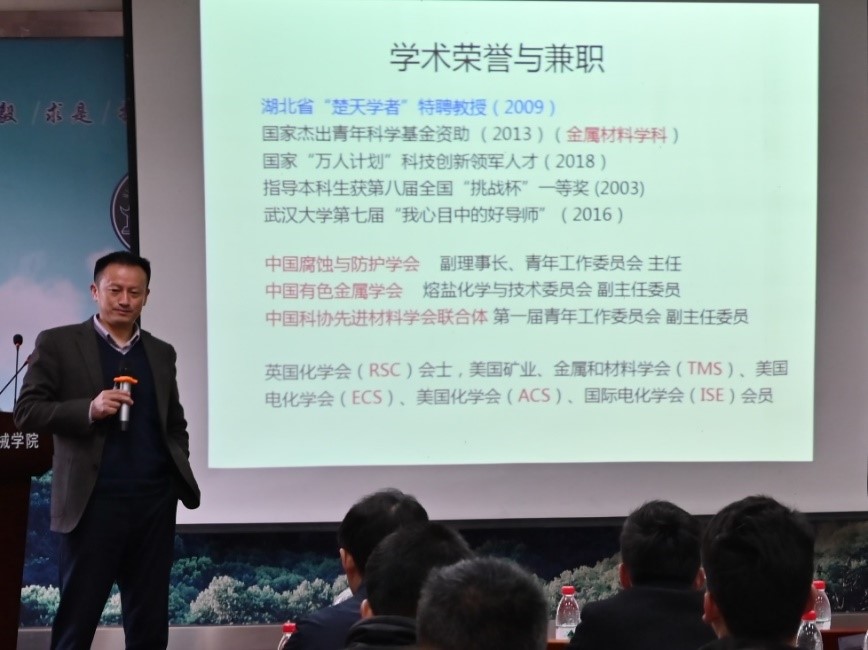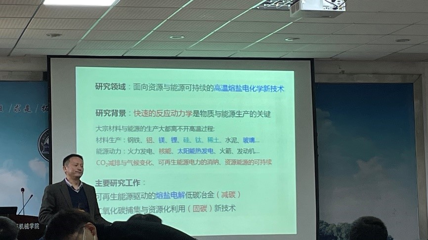 会上,汪的华首先介绍了他的个人基本情况和学术荣誉与兼职,接着介绍了他的主要研究领域——面向资源与能源可持续的熔盐电化学新技术,主要的研究工作在于可再生能源驱动的熔盐电解低碳冶金和二氧化碳捕集与资源化利用新技术,最后依次从熔盐结构与性质、反应、材料与技术装置等方面介绍了高温熔盐电化学技术的基础研究、技术发展及其工程应用。