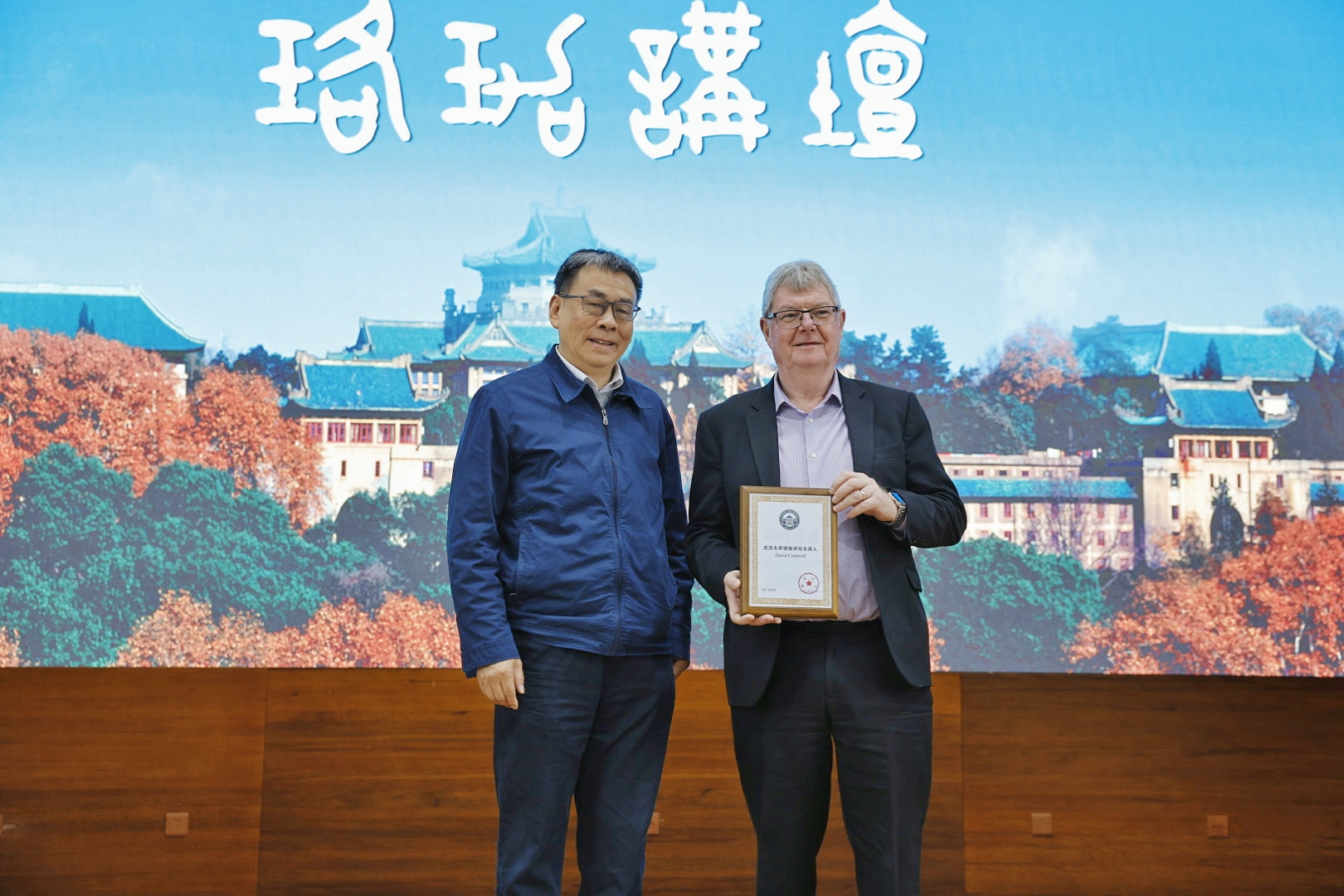 刘胜院士为David Cardwell 院士颁赠珞珈讲坛纪念牌