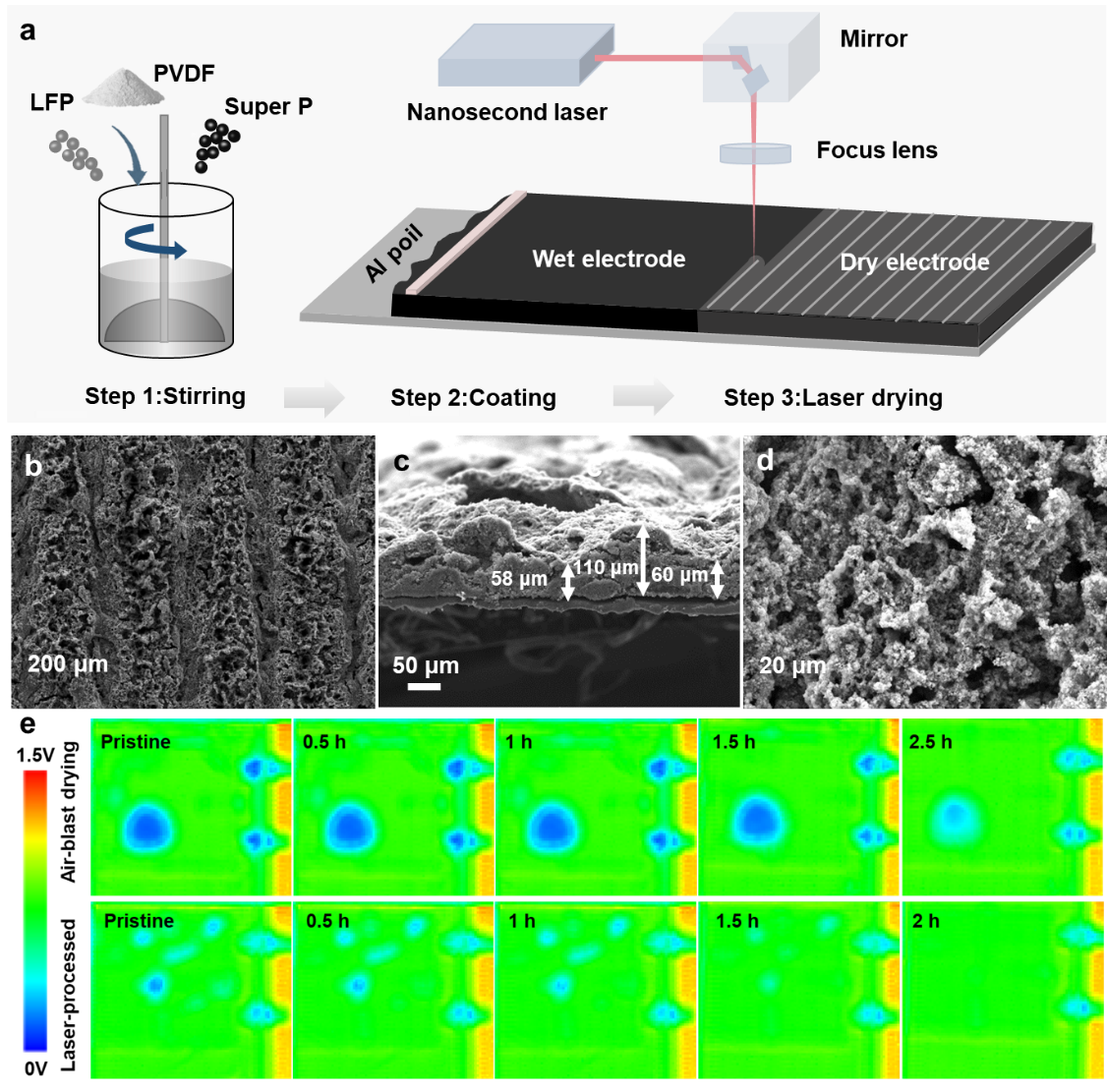 随着电动汽车与便携电子设备对续航与快充的需求日益迫切,锂离子电池正面临能量密度与功率性能的双重挑战。厚电极技术通过增加活性物质负载量,被视为是突破能量密度限制的关键路径。然而,电极增厚不可避免地导致离子/电子传输路径延长,内阻与极化效应加剧,严重制约了倍率性能与循环稳定性。更为关键的是,现有制造工艺普遍将电极的“干燥”与“结构化”工序分离。这种分步模式不仅流程繁琐、能耗高、效率低,更易引入结构缺陷,成为制约厚电极性能提升的工艺瓶颈。