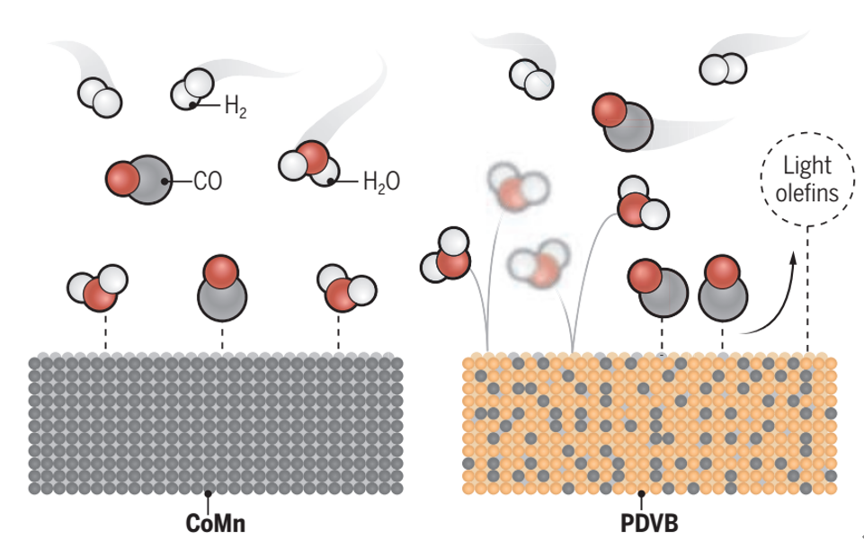 水是合成气转化反应中的副产物,会通过覆盖催化活性位或诱发副反应而限制合成气制取低碳烯烃的催化效率。近期,浙江大学肖丰收/王亮团队和中科院精密测量院郑安民团队合作报道(Science2022,377,406-410),将一种疏水性的助剂PDVB(聚二乙烯基苯)和CoMn催化剂物理混合后,反应中CO转化率从32%大幅提升至64%。CoMn/PDVB具备CoMn催化剂反应条件温和、对低碳烯烃选择性好的优点,而PDVB作为疏水性导水通道加速了水分子的扩散、削弱了水分子与CO在CoMn催化剂上的竞争吸附,进而在CoMn催化剂上暴露出更多的催化活性位,提高了合成气向低碳烯烃的转化效率。