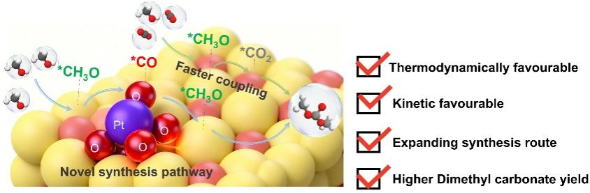 定明月教授团队通过羟基化诱导Pt自发再分散策略,成功制备Pt单原子嵌入型CeO2催化剂(Pt1/CeO2–SO),重构晶格氧配位结构为Pt-*O-Ce,显著提升了其电子接受能力。这些强吸电子晶格氧促进了高活性*CO中间体生成,进而触发了一条热力学有利的*CH3O-*CO偶联制碳酸二甲酯的新合成路径。此外,这一针对晶格氧的电子修饰优化了催化剂的电荷分布,协同地调控了催化剂对CO2和甲醇的吸附活化,进而显著降低了*CH3O-*CO2偶联能垒,改变了CO2和甲醇直接合成碳酸二甲酯决速步,降低了整个反应的能垒,显著加快了CO2和甲醇直接合成碳酸二甲酯反应速率。优化工况后,Pt1/CeO2-SO催化剂表现出62.1 mmol/g的碳酸二甲酯产率,较传统催化剂提升6倍。本研究揭示了晶格氧修饰工程在革新碳酸二甲酯合成反应路径和协同优化反应物吸附活化中的关键作用机制,为甲醇升级与CO2资源化高效转化提供了理论指导和新的认识。