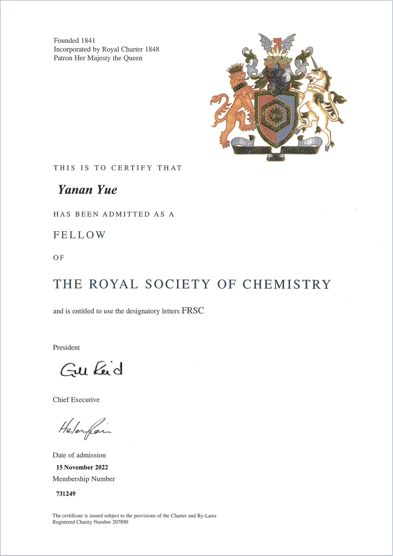 英国皇家化学学会成立于1841年,是世界上历史最悠久的化学学术团体,也是最有影响的国际权威学术机构之一。根据专家推荐,学会每年遴选英国及国际上在化学相关研究领域取得杰出成就的科学家为其会士。