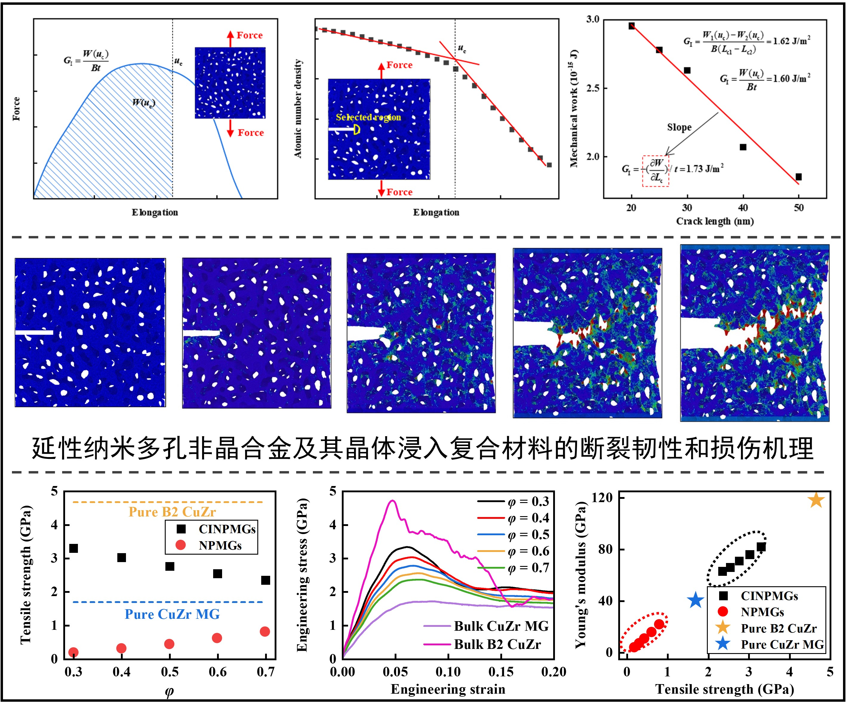 作者针对纳米多孔Cu-Zr非晶合金的断裂韧性和损伤机理展开深入分析,兼顾表面能和塑性耗散能效应,首次获得了该结构的断裂韧性。对力学性能-微结构的关联性进行了量化表达,从原子尺度阐述了裂纹扩展行为和结构失效机理,并设计了力学性能更优秀的纳米非晶/晶体双连续复合结构,建立了高韧性材料的力学性能-材料属性-拓扑结构一体化综合分析体系。该研究是目前为止,针对纳米多孔非晶金属力学特性较为系统和全面的深入探讨,不仅深化了对其断裂行为的理解、拓宽了定向调控优化力学性能的新思路,更为诠释各类轻质复合材料的断裂行为提供了普适性参考。