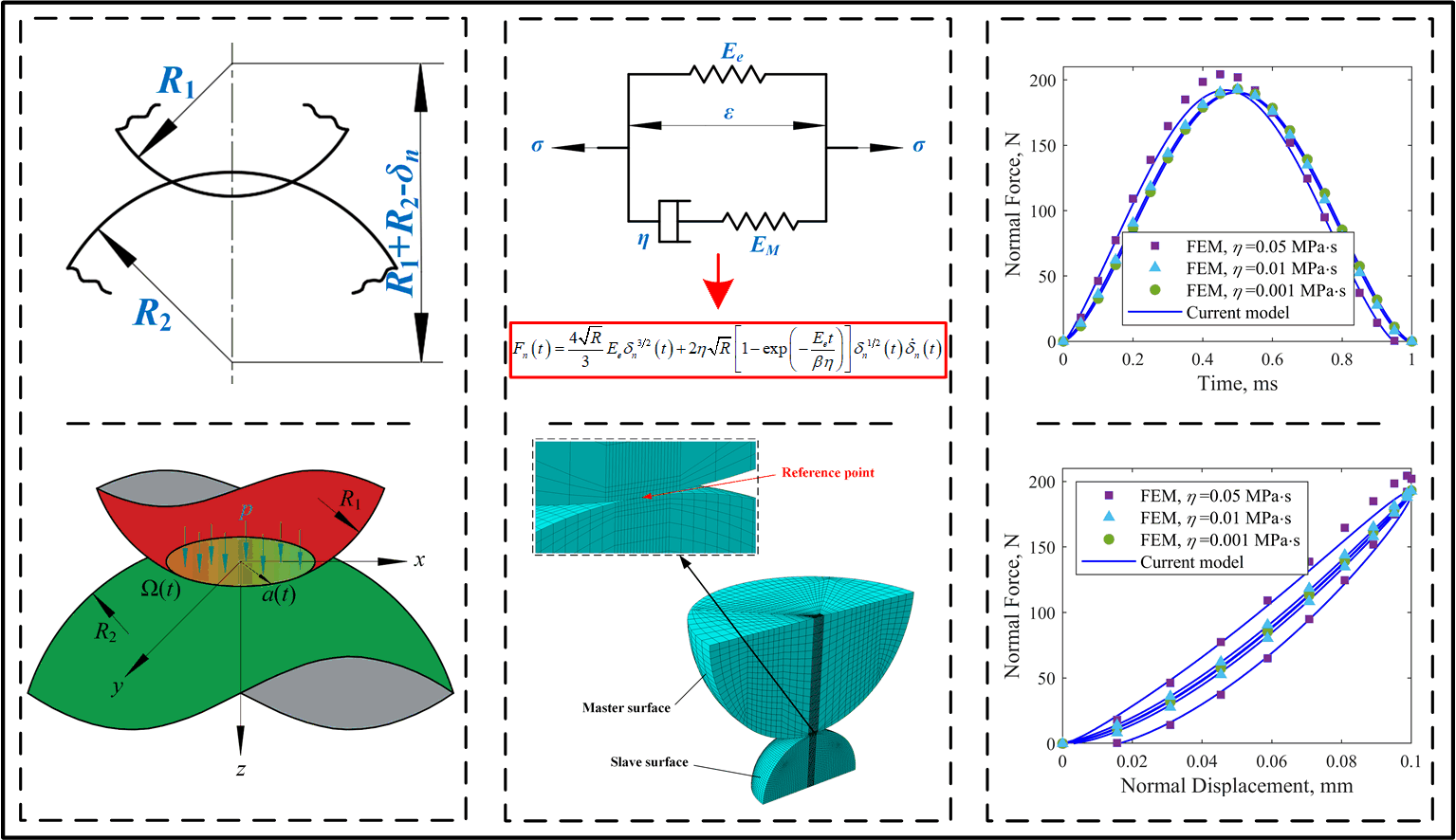 该研究从标准线性固体模型出发,利用拉普拉斯变换及其逆变换求解微分方程,获得对应的一维应力应变关系和松弛函数;基于弹性解中的等效弹性模量的松弛函数替换求得粘弹性体接触应力表达式;在接触区域上的接触应力积分最终获取法向接触力的显式表达式。构建的法向接触力模型可以利用粘弹性体的材料参数,来实现对接触过程的能量耗散现象的阐述。进一步,作者通过有限元二次开发,编写定义粘弹性材料属性的用户材料子程序,验证了该法向接触力模型的有效性。本研究完善了粘弹性接触力学的理论框架,原创性地建立了能量耗散与传统力学材料参量之间的关系,为粘弹性接触问题的量化分析提供了有效手段。