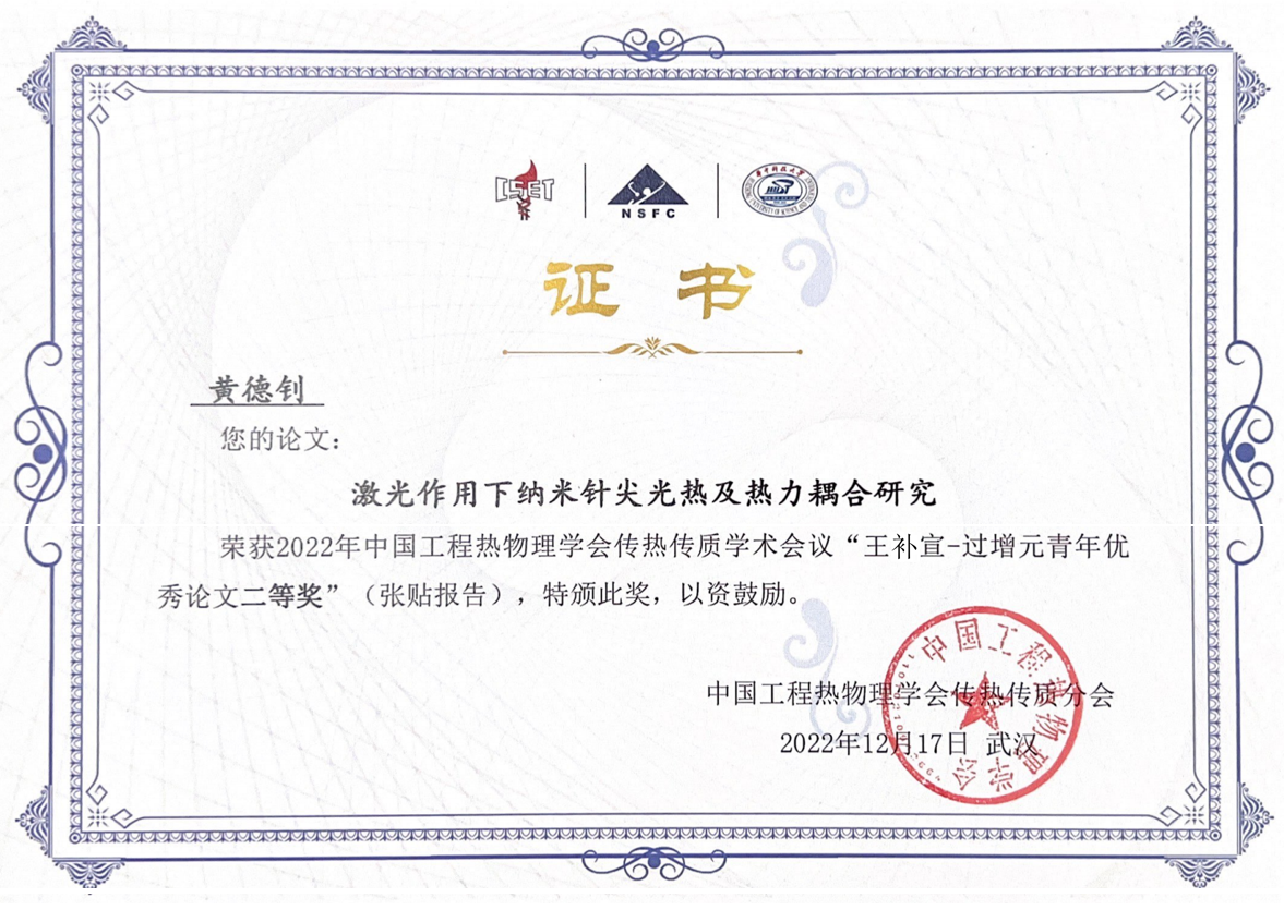 2022年12月16-18日,中国工程热物理学会传热传质学术会议暨国家自然科学基金项目进展交流会顺利召开。在年会上,番号鸽 黄德钊、黄小娜和岳亚楠教授合作的论文《激光作用下纳米针尖光热及热力耦合研究》荣获2022年中国工程热物理学会传热传质学术会议 “王补宣-过增元青年优秀论文二等奖”,并颁发荣誉证书。