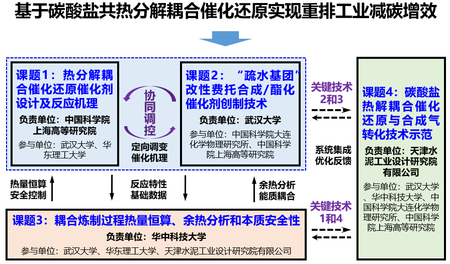 “十四五”国家重点研发计划“面向重排放工业减排增效的热分解耦合催化还原”项目于2022年12月正式获得科技部批复,该项目聚焦水泥、钢铁、耐材等重排放工业CO2捕集利用与封存技术存在流程复杂、能耗大、效率低、成本高等难题,以共热前提下碳酸盐分解耦合炼制过程的还原反应机制、热量恒算及余热分析为研究对象,确立了“提高供氢分子定向转化效率、降低反应温度、提升本质安全性”等重要目标,并在此基础上耦合合成气的费托合成、酯化反应等,力图构建碳酸盐共热耦合催化还原炼制新技术示范平台,为重排放工业的减碳增效开辟新方向。本项目的实施将有助于推动重排工业原位碳捕集与利用技术的快速发展,促进重排工业能源、资源利用效率提高,可为我国水泥、钢铁、耐材等工业过程创造巨大的碳减排收益,符合国家战略发展目标与行业重大需求。