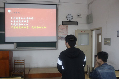 观今宜鉴古,无古不成今。历史从来都是我们研究未来最好的范本。为了增进同学们对当时的了解,同时也为考验同学们对当时到底有多少了解,我们进行了党史知识竞赛。主持人戴俊涛同学在PPT上展示了多道不同的党史知识竞赛题。内容涉及中国共产党党史类的抢答题和有关中国早期共产党员的人物题。同学们都积极参与抢答,在答题的过程中也收获了不少关于党史的知识。
