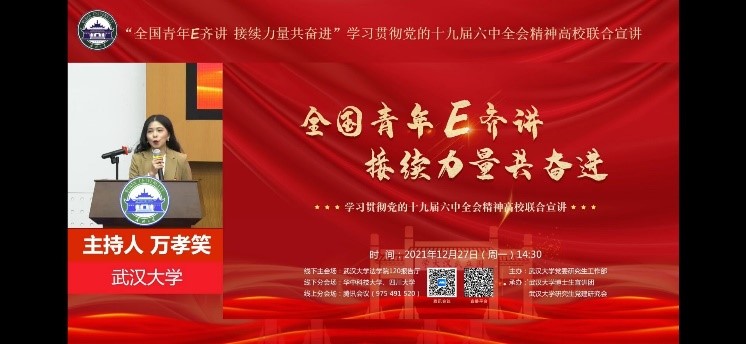 本网讯(通讯员:何雨薇 编辑:雷世界 审核:刘泽庭)1227日下午,学院各研究生党支部组织支部成员观看了“全国青年E齐讲 接续力量共奋进”高校联合宣讲直播,学习贯彻党的十九届六中全会精神,系统把握党的百年奋斗的重大成就和历史经验。