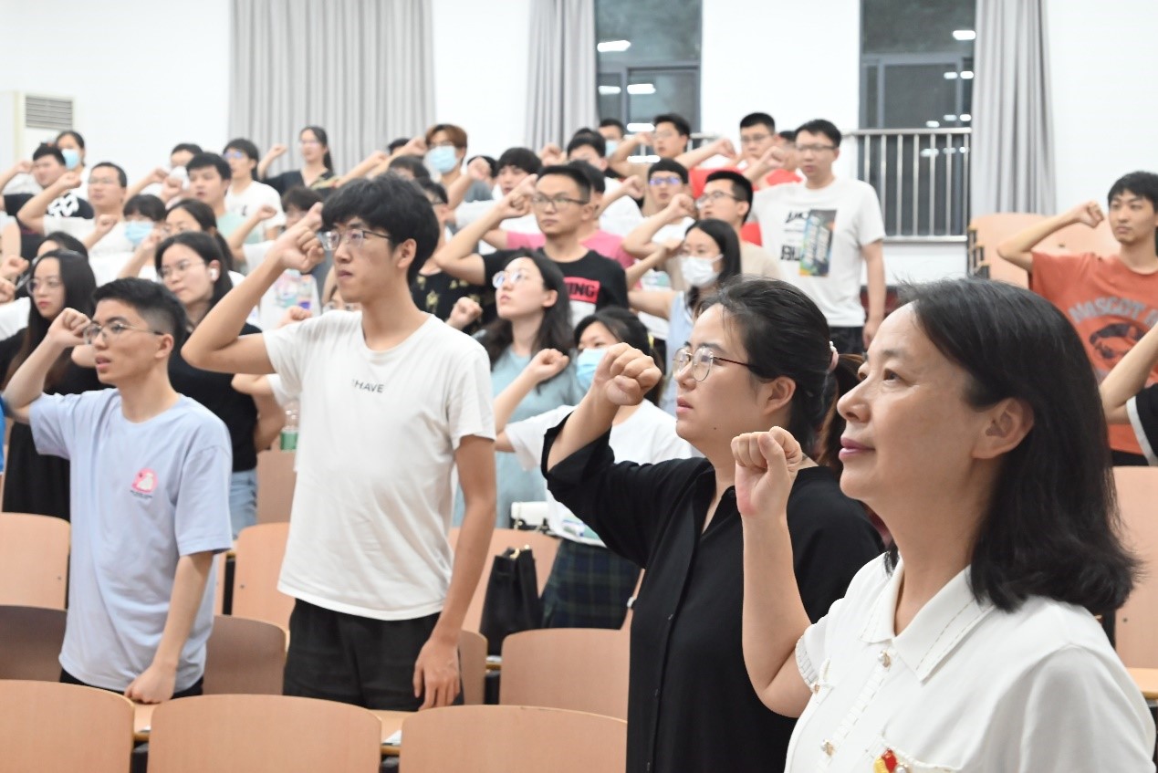 本网讯(通讯员、编辑:王豪斌 审核:刘泽庭)6月20日晚,学院在工学部五教举办2022届毕业生党员主题教育活动,院党委书记孙萍为学院全体2022届毕业生党员讲党课,带领全体党员重温入党誓词,增强毕业生党员的思想自觉、政治自觉和行动自觉,引导学生深刻认识“两个确立”的决定性意义,进一步增强“四个意识”、坚定“四个自信”、做到“两个维护”。
