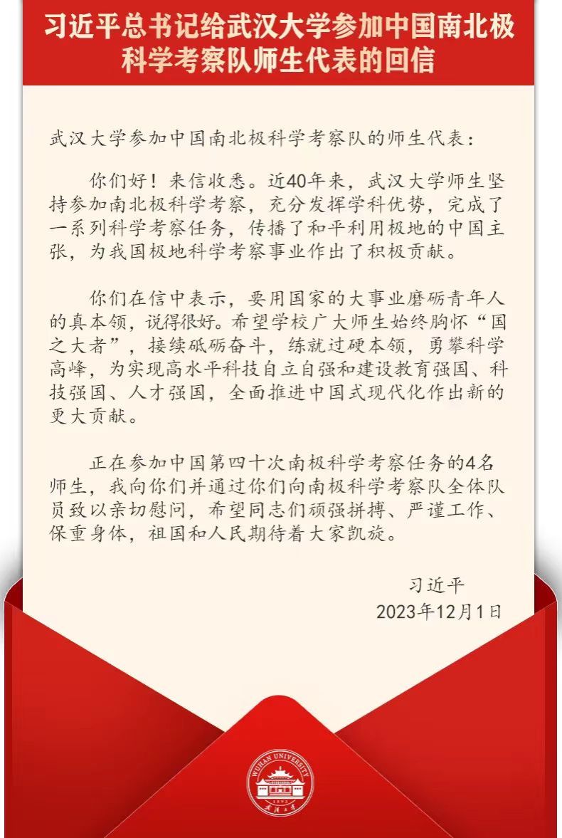 读了这封回信,我深受启发。这封信明确肯定了我校师生在南北极科学考察的贡献,同时也向全体科研工作者传递了坚持和拼搏的精神。国家的繁荣强大离不开科技的发展,科技的发展又离不开广大科研工作者的辛勤付出和无私奉献。