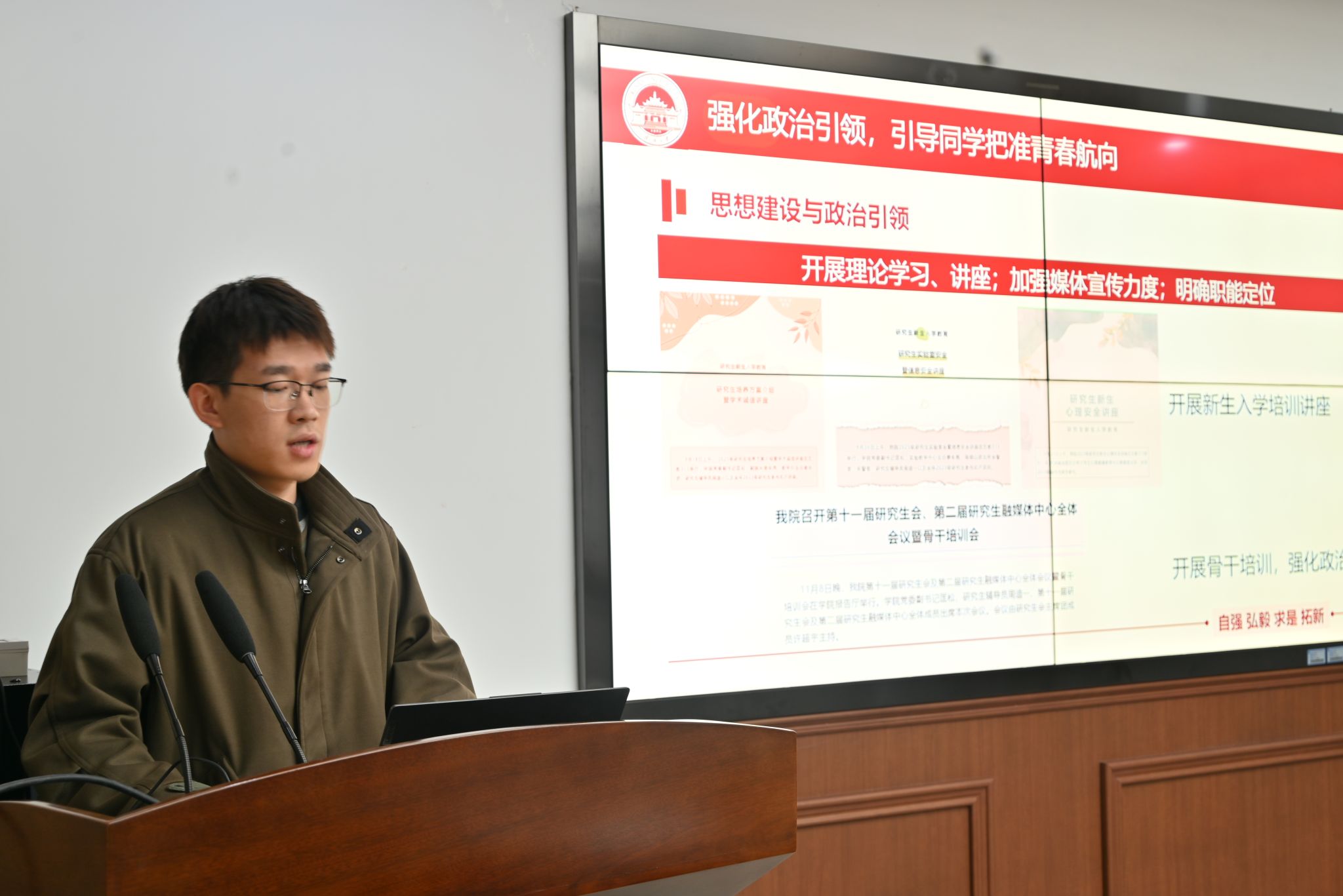 院研究生会心理健康部负责人李斌同学分享了心理健康部近几个月来所推出的一系列活动,包括新生心理安全讲座、研究生谈心谈话“温馨行动季”6.0、“关爱口腔,健康生活”口腔知识科普与义诊,以及与其他部门协办的师生趣味运动会和元旦晚会等活动。这些活动不仅在心理健康领域提供了关键性的支持和教育,同时也在促进同学们之间的交流与凝聚力方面发挥了积极作用。展望未来,心理健康部将不断探索更多有益于同学们身心健康的创新性项目,为研会的多元发展贡献更多力量。