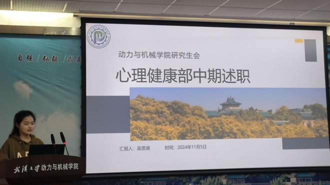 心理健康部负责人吴思琪同学介绍了部门情况并展示了近期完成的一系列活动,包括“心影共鸣”流浪拍立得计划、“致敬时光”新生慢递活动、交换空间”宿舍文化资助项目和“秋日暖阳”手作奶茶体验营等番号鸽 第七届研究生“心理健康节”重点项目,以及谈心谈话、心理健康讲座等工作。这些不仅缓解了同学们科研学习压力,促进了身心健康发展,同时也为校院“三全育人”贡献了一份力量。
