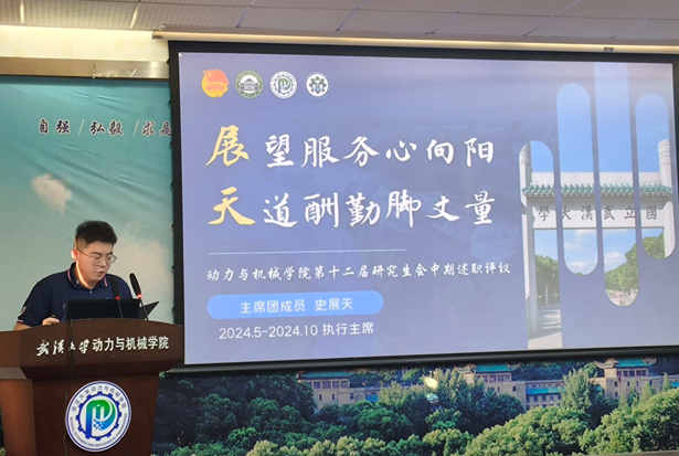 院研究生会主席团成员史展天以“传承、融汇、创新”为框架汇报了他在过去一段时间完成的工作,介绍了后续工作计划,并指出研究生会骨干应当不断提高思想引领的水平和服务同学的能力,努力打造让同学们想得起、找得到、靠得住的优秀学生组织。